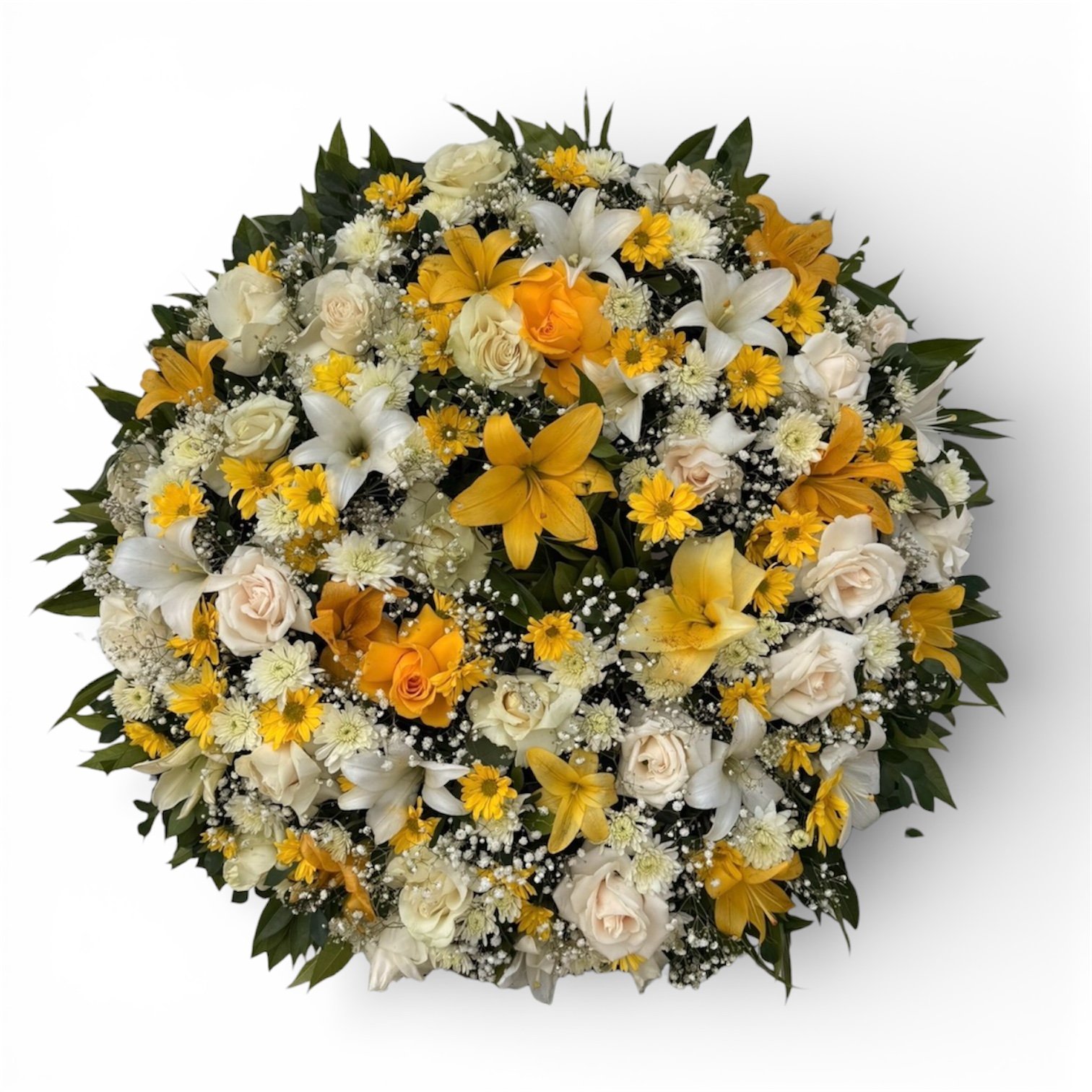 • Crisantemos y Margaritas: Flores de relleno en color amarillo y blanco que dan volumen y textura al diseño.